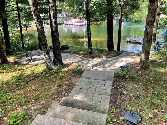 Water views from EVERY window in this Legend Lake, quality constructed, 13-sided polygon home, built to enjoy nature! This unique, very private property features living area w/gas fireplace, vaulted cedar ceiling, and spiral staircase leading to the over 230 sq. ft. loft not included in total finished sq. ft. This home is tastefully decorated, complete with owner's suite, 2nd bedroom, 2 full baths, kitchen, dining and laundry area. Work from your home office with fiber optic internet and monitor your security system remotely. Enjoy more of nature on the wrap-around deck & lower patio. Beautiful landscaping, patios and walkways lead you to the 166' of sandy frontage. Additional space to entertain in heated garage w/T&G pine walls and epoxy flooring. Sellers request to review offers 8/13.
