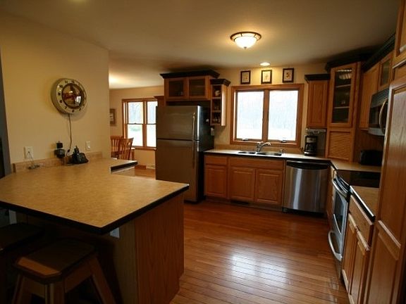 Welcome to your secluded wooded sanctuary nestled on over 8 acres. Spacious one story living boasts gleaming hardwood floors, vaulted ceilings, large windows, fireplace, main floor laundry, whirlpool master suite, expansive decks and front porch, plus walkout lower level that's ready to finish. Radiant water heated floors in home and the 42 x 63 foot shed (that has it all including office, half bath and set up for hoist). Trails and abundant wildlife. Live your life!
