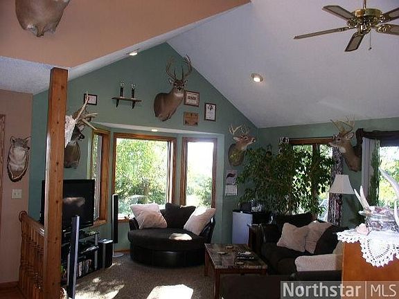 Nicely updated with new roof, carpet, counter tops, stainless appliances & 3-season porch on 5 Acres, no covenants. 40x80 Pole Bldg. with 16 ft. walls, 220 outlet, concrete and dirt floor. Finished Garage w/ wood burning stove/supplemental heat for home!