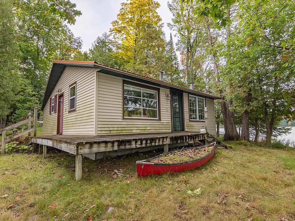 Nestled on a sandy point with over 300 feet of beautiful frontage, this 3-bedroom, 1-bath cabin, set on well over 1/2 acre, is a rare opportunity to own lake property with unbeatable views and direct water access. Just steps from the shoreline, the cabin's setting offers peace, privacy, and the perfect spot for lakeside living. Inside, the home is plumbed for water and ready for your finishing touches. While there is no well, the property includes a holding-tank septic system, making it functional for immediate use and offering plenty of room for upgrades. A newer roof adds value and peace of mind as you plan your updates and renovations. This cabin is ideal for buyers looking for a an amazing property with great bones and an unbeatable location. Envision? a cozy seasonal retreat? The possibilities are endless with this unique property. Don't miss your chance to invest in a rare lakefront property and make it your own!
