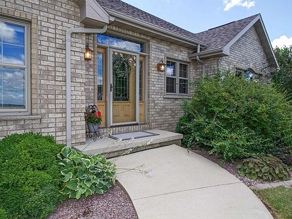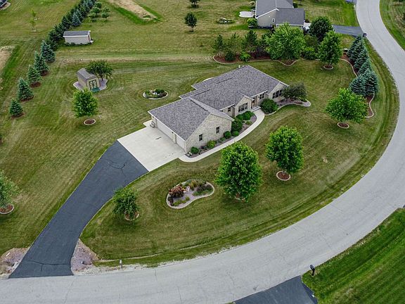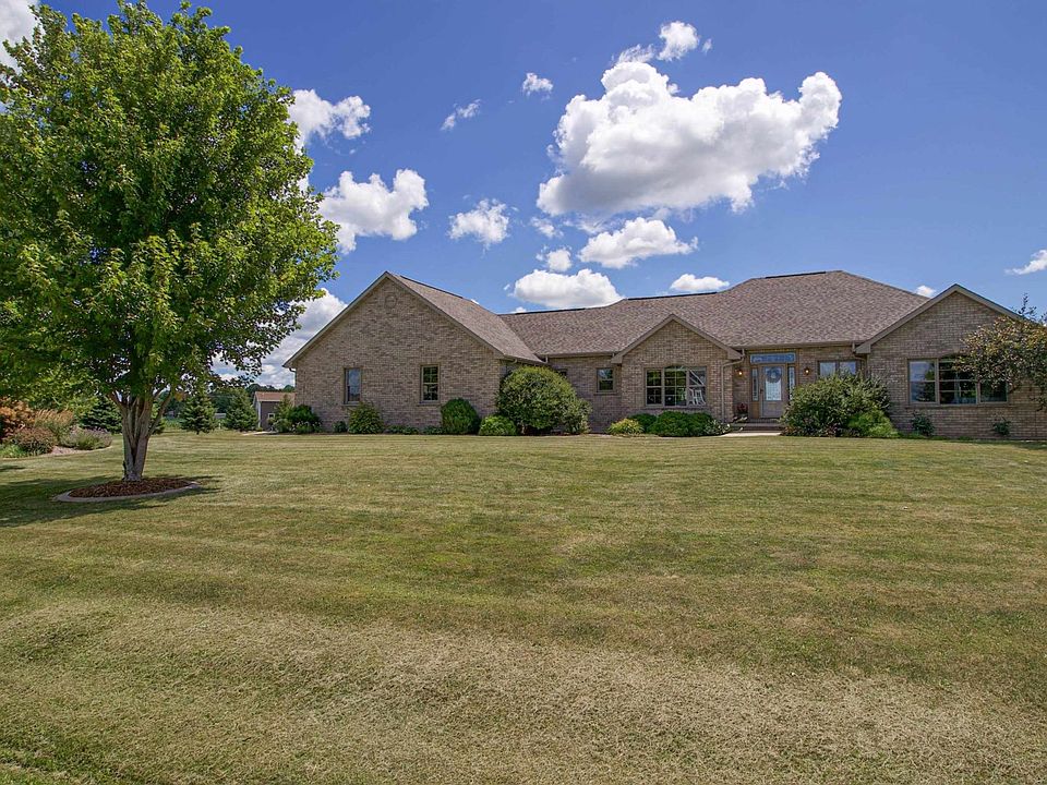 Open House Wednesday August 3rd from 4:00 PM to 6:00 PM. Attractive all brick - former Parade Home situated on a well landscaped one acre (per assessor) lot with picturesque views of the countryside. Features include a gourmet kitchen with hickory cabinetry, gas range, full size refrigerator and freezer, indoor grill, LR w/gas fp and archways accented with brick, main floor office, FF laundry, primary suite with walk-in shower, soaking tub, and spacious walk-in closet. The LL has 2 bedrooms, full bath and family room. There is in-floor heat throughout the LL and under the tile floors on the main level. A dream garage that is insulated, finished, heated, floor drain, epoxy flooring and a retractable screen door. Covered patio w/stamped cocrete flooring. 10x16 Shed