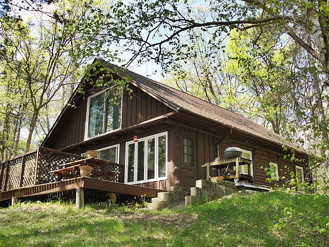 Charming cabin on peaceful lot w/over 200' hard sand frontage on no-wake Grass Lake. 2 bdrm plus large upper add. for bdrm/game room. Main level just refinished w/new flooring, cabinets & updated bath. Beautiful views from almost every window, original log interior, sunroom, w/b f/p, tons of character w/original wood beams & doors. New poured patio overlooking over an acre! Located on dead end road, direct access to trails! Furnishings can be negotiable, appliances & lawn mower included & brand new dock can be purchased for $4,500.
