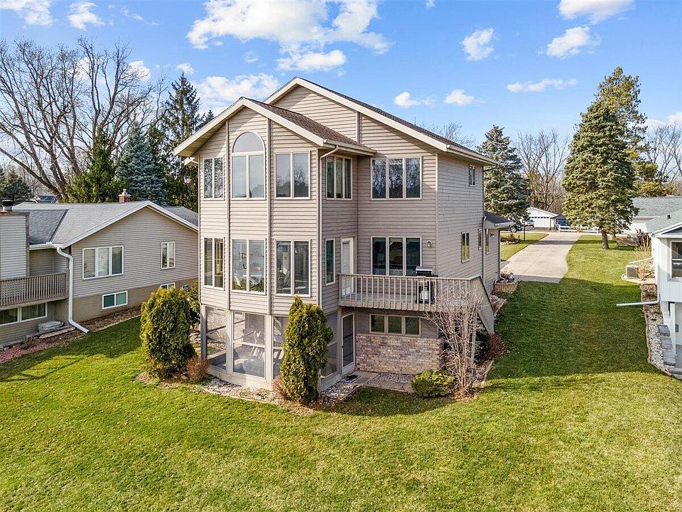 Rare stately home located in the bay of Blue Spring Lake. This contemporary built home features 3 levels with a walk out LL leading to 65 feet of frontage. Main floor features large great room, 4 season sunroom overlooking the lake with deck and stairs down to the gently sloping back yard. 1st flr bedroom with full bath, powder room, 1st flr laundry, kitchen with dining area overlooking the lake and an attached 2.5 car garage. 2nd floor features 2 large bedrooms, full bath and another sunroom overlooking the lake. One bedroom features a wic, the other bedroom has extra office space. LL has full bath and plenty of space for the rec rm of your dreams. Screened in porch off the back of lower level. Extra garage could be built in front of house. Home could come fully furnished if desired