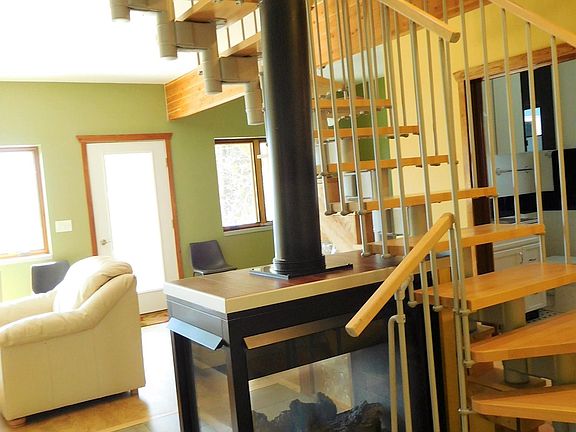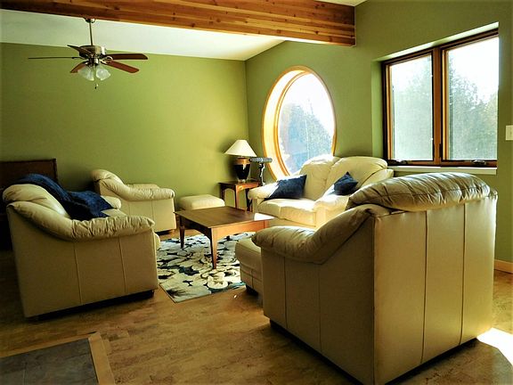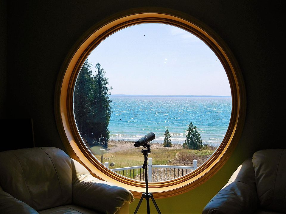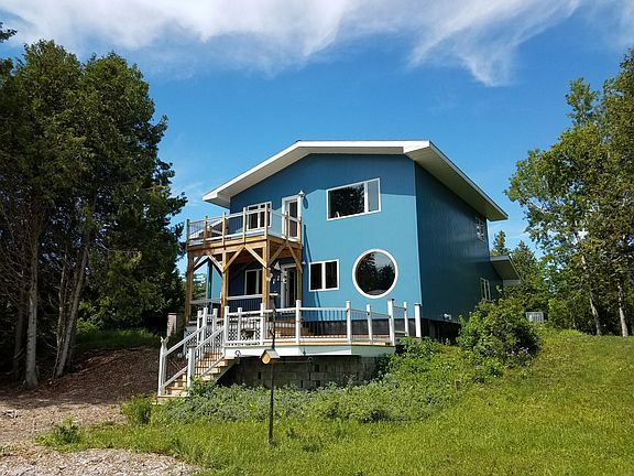 ''LeBarbe Bleu'' Lakeside Modern design describes this Straits of Mackinac home on the northern shore of Lake Michigan, 7 min. to historic downtown St. Ignace and the Mackinac Bridge in Michigan's Eastern Upper Peninsula. This 2-story eclectic designed home features an upper master suite with a jacuzzi tub overlooking Lake Mich. Master bath 2nd BR, office area and lg. bonus/4th BR complete the upper level. The main level features 1BR 1BA, kitchen to 2C garage and mudroom-closet entry. The lakeside living area features a steel/wood staircase to 2nd floor, gas fireplace, dining area, lg. windows and door to outside 3 -tier deck. Shore views of St. Helena Island, Mackinaw City & Bridge. Kayak, boating, swimming, hiking galore. Professionally managed with year-round vacation rental options.