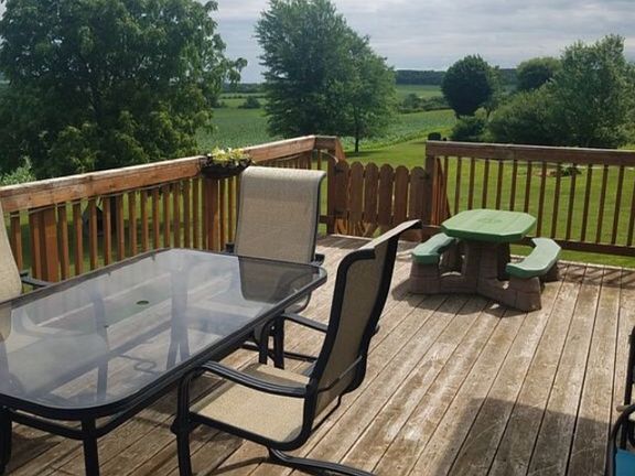 Enjoy "country living" with all the conveniences of living less than a half mile out of town with this nearly 3000 sq ft split level home on 2+ acres. Main level features 2 bedrooms, and open concept living/dining/kitchen with all new flooring and completely remodeled kitchen and bathroom. There is also a large sunroom just off the kitchen/dining room with extra cabinets and countertop, great for entertaining, and beautiful views overlooking the large cedar deck and view of the countryside and cityscape. The upper level features a large master bedroom including 2 walk in closets, and a very large family room with wood burning fireplace. Lower level features another small living/rec space with two large bedrooms, a second bathroom, and laundry room (potential for multifamily living). Lower level also includes walk out to outside, and entry to an additional 10x22 garage/storage area with overhead door. The property boasts beautiful 360° views of the countryside, and includes 4 Apple trees, raspberry bushes, and established rhubarb plants. New heat pump and L.P. Gas furnace in 2010, New roof, siding and windows in 2012, and all new flooring and complete remodel in 2015. Please call 7152991610 for further information or to schedule a showing.