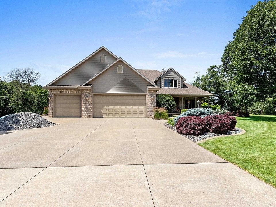Nestled on 5.4 acres of mostly wooded land at the end of a quiet cul-de-sac, this stunning 4-bedroom home offers the perfect blend of comfort & luxury. Main floor features a spacious en-suite bedroom, an office, & a convenient laundry room. Great room impresses with cathedral ceilings & a cozy gas fireplace. The large, modern kitchen is equipped with granite countertops & stainless steel appliances. Walk-out lower level boasts a full bath, wet bar, family room with a fireplace , a bedroom, & 3-season rm. Separate 4-car garage has finished space above, complete with a gas fireplace & bathroom. With the serene & private setting, the property is conveniently close to amenities, offering the best of both worlds. The home is Pre-Inspected (defects fixed) & has a whole home generator.