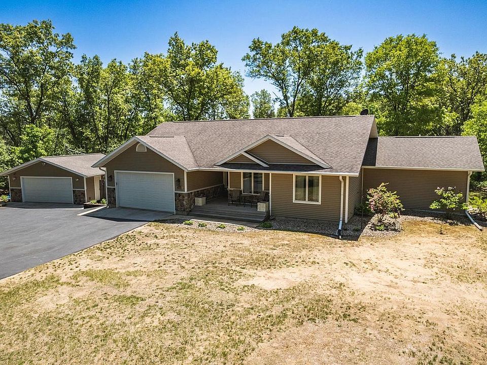 Nestled back off the road, tucked in amongst the trees, sits a stunning 4 bedroom, 3 bathroom home on 3+ acres. Foyer opens to a nice size living rm w/1 of 2 gas fireplaces. Open dining area that overlooks the private deck. Primary BR hosts an ensuite BA w/a large beautiful tile shower & dual vanities. Well laid out kitchen w/convenient access to attached 2 car garage. Enjoy coffee on the shaded large deck w/entry to the partially fenced large yard. Finished LL you'll find a wet bar and super sized bonus room to catch the game. Addt'l fireplace keeps it nice & toasty. Awesome laundry rm w/access to the back yard, utility sink & pet wash - wait what?! How convenient is that? Spacious storage room & addt'l 2 car detached garage. Close to WI Dells attractions, I90/94 & Wi River Boat Landing.