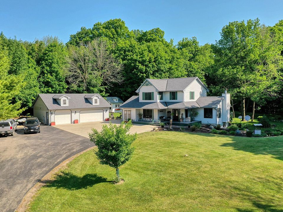 Tranquil setting just inside Dodge county best describes this custom home on almost 13 acres! Relax on covered porch. Foyer opens to family room, powder room and KN/GR. Open concept with engineered HW floors, Wood burning FP, Breakfast bar Hickory cabinets stone backsplash. Stainless steel appliances, range with Dbl oven. Patio doors access the rear deck oasis enjoy peaceful surroundings and the wide array of wildlife. All interior doors are six panel oak. Upstairs, 2 BR's ,3/4bathroom and EnSuite MB with HWF and WIC. Walkout lower level office,pantry workout area. Room for toys in the detached 3.5 car garage, custom shed and 15'x30' pole barn. Perennial rock gardens, wildlife pond, creek, paths,mature hardwoods fill the property. Updates, New roof 2021 Furnace /AC 2019Water Heater 2019.