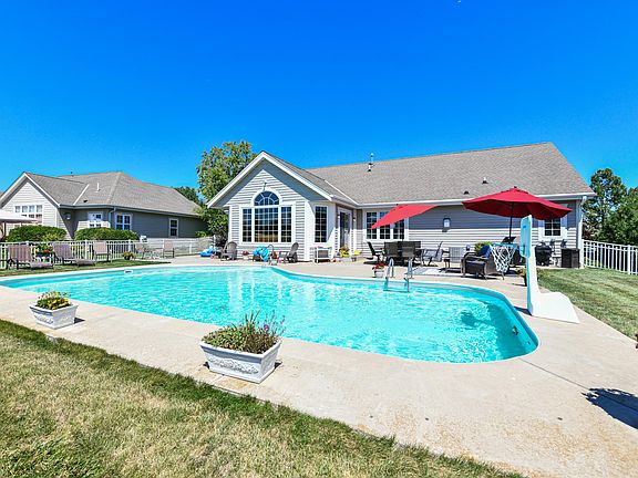 Expert Craftsmanship in this beautiful Quietwood Creek Ranch. You'll love the split bedroom, open concept design. Everything in this home screams quality including the 6 panel doors, maple hardwood floors, top of the line Hurd windows. Gorgeous kitchen features maple cabinetry, granite countertops, & high end appliances and opens to the Great Room and Family Room. Natural Light floods the living space, with spectacular views of beautiful heated inground pool, patio, fenced yard, and neighborhood common space, providing a bonus expansion to your yard and privacy! You can have it all~ perfect floorplan, quality products, and fabulous entertainment space!