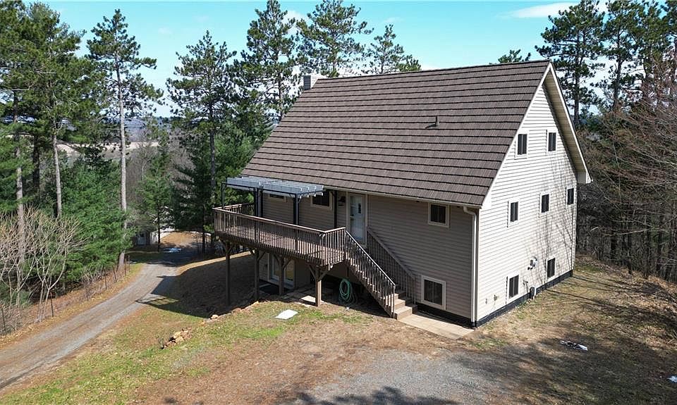 This gorgeous Chalet home has everything you are looking for! Stunning ridge top views, HUGE 30x44? garage for all the toys, 15.45 acres of prime hunting/recreation land & tons of privacy. Open concept main level features floor to ceiling windows, vaulted ceilings w/ fans & wood flrs. Kitchen has amazing cabinet/quartz countertop space, brkfst bar & a dining area that can easily fit a 10+ person table. Master suite offers space for a king bed set, private bath w/ dbl sinks & abundant storage plus a walk in closet. Walkout lower level has a family room w/ wood fireplace, 2 more bdrms, laundry w/ sink & storage rm. A 12x15 upper loft is a perfect office/play room/craft room or future 4th bdrm. Other features include: set up for future generator, 10x17 tarp shed, extra laundry hookups on main level & dual heat source w/ outside wood boiler. Land also has trails, a half acre clover food plot for getting trophy bucks, turkey, bear, birdwatching & the seller has even had an Elk on his land!