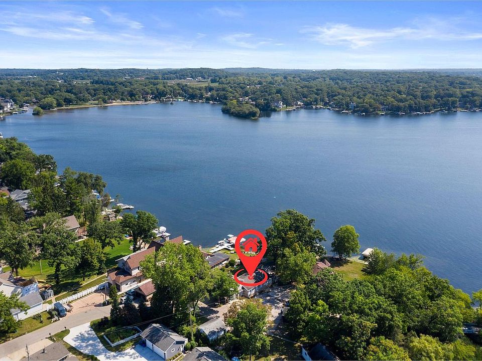 Stunning panoramic views abound at this 5BD/1.5BA home on Little Muskego Lake. Shaded by mature oak trees, this deep lot w/ 60ft of frontage, is absolutely picturesque. Inside you'll find an updated eat-in kitchen w/ quartz counters, stainless appliances and LVP flooring. The large living room w/ stone hearth overlooks the dining area, showcasing vaulted ceilings and lake views. The primary bdrm and laundry area are also on the main level for convenience. Head outside to find a charming cabana w/ covered patio, great for entertaining, overlooking the backyard and waterfront deck--the best seat in the house! The backyard also features a rare small boat launch, which doubles as a beach, making easy access to the water. Dock your boat at the updated aluminum pier w/ landing and bench seat.
