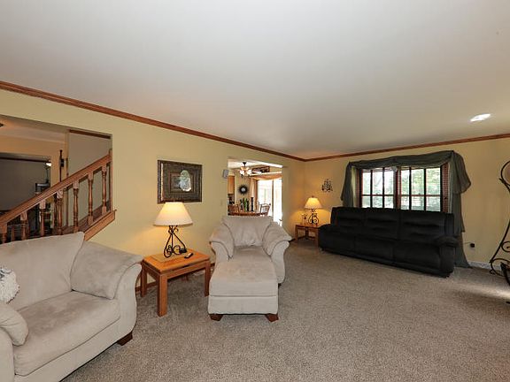 Very well maintained mostly maintenance free home on just under 1/2 acre. Located on a low traffic Cul- De-Sac. Kitchen with abundance of Oak Cabinets and Quartz Counter Tops. Formal Dining Room plus Dinette off Kitchen. Large Great Room with gas fireplace. Main floor laundry room with folding table. Jumbo Master Bedroom Suite with walk-in closet and 2nd closet. Master Bath with large shower stall. Two additional over sized bedrooms. Patio door off dinette to huge Concrete Patio with Hot Tub. 2 1/2 Car Garage with extra area to the back is perfect for work space and lawn equipment. Concrete drive with 12x30 apron on side of garage. Tear off new roof 2 years ago.Master Bedroom fan shown in photos. New fan will be installed.