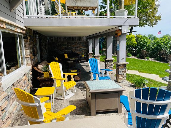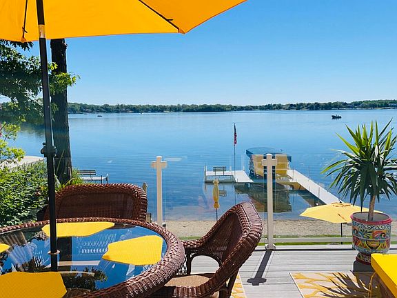 THE WATERFRONT home you have been waiting for! Fantastic pea gravel frontage! Some of the best views of the lake from inside & out! Fully updated! 3 BR, 2 baths on the main floor and an additional 4th br (no egress window) and full bath in the exposed lower level. Entertainers delight! White kitchen w 2 patio doors to deck! Lower level lounge w kitchen cabinets, dishwasher, ice maker, wine & commercial frigs. 2 gas fireplaces. Hydronic heated lower floors. Extra deep 2.5 car GA with prof finished floor , New concrete drive in 2021. Located on a Dead end street. The lake side of the home has an in-ground sprinkler system. Updates include: windows, interior & exterior doors, patio doors, furnace, lighting,bathrooms, LPsmart siding w thick insulation, ga door,flooring,deck,patios,well pump