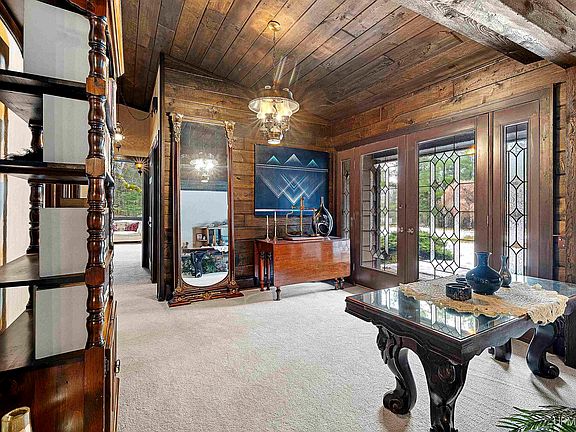 This beauty has the flare of a Frank Lloyd Wright design! No expense spared. Grand open rooms with tongue and groove vaulted ceilings throughout. Formal front entry, sunken living room, formal dining room, and den is of open concept. Walls of floor to ceiling windows not only allow natural daylight to flow in, but you're surrounded by views of nature! Large cook's kitchen with abundance of custom cabinetry, snack bar area, and separate dinette with sliding door that leads to covered deck area. Back entry doubles as first floor laundry and leads to 3 car attached garage. Garage has a woodstove. Master bedroom suite is all open with vaulted ceilings, floor to ceiling windows, jacuzzi hot tub, separate shower area, and walk-in closet. Situated on private 4.38 acres with abundance of wild life. NW corner of property has small part of a pond on it. Custom blinds, window treatments, central vac, water softener, LP tank, stove, & refrigerator included. Don't miss out on this house & property!