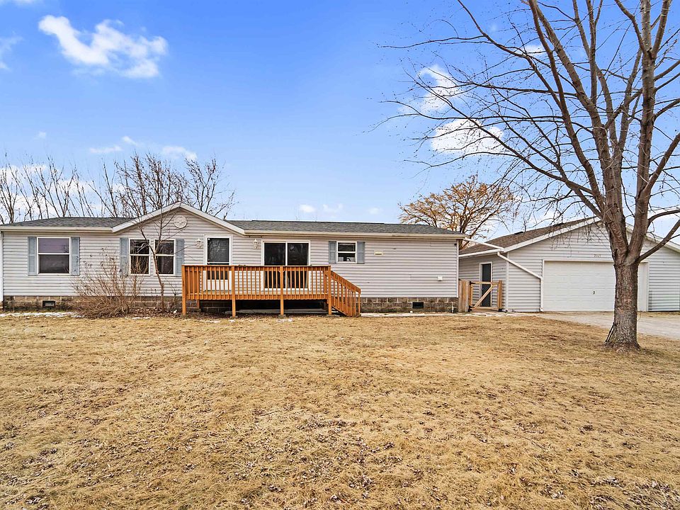 Brillion 4 bedroom home located on a HUGE lot! You'll step inside and immediately fall in love with the open concept floor plan and gas fireplace for your cozy nights. Kitchen has a designated dining area with a patio door to the front deck. All kitchen appliances are included too! Primary bedroom has its own full bath with double sinks. 3 additional bedrooms, second full bathroom and first floor laundry complete this home. 2 car garage and fully fenced in yard are a big bonus!