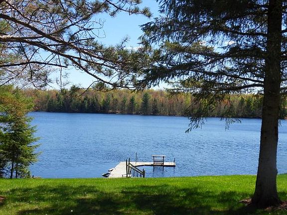 Perfect Northwoods Waterfront Getaway! This 3 bedroom 2 full bath lake home has it all, with a spacious kitchen/dining area opening to the lakeside deck, large living room with woodburning fireplace, lovely master suite with walkin shower and whirpool tub, 2 additional nicely sized bedrooms, another full bath, full unfinished basement ,main floor laundry, enclosed porch, large lakeside deck with hot tub , a 2 car attached garage and another 2 car detached garage for all the toys. The home features a new furnace, new roof, and has been well maintained.Enjoy the summer nights around the lakeside firepit and come up for skiing in the winter. The level lot provides easy access to the sand frontage, and 60 acre Hildebrand Lake offers all the water rec you want including excellent swimming,tubing, pontooning, lunker bass and gorgeous bluegills. Only 10 min frrom town and close to hunting, fishing, ATV trails, snowmobile trails, and Camp 10 for skiing. This home has it all. Come take a look!