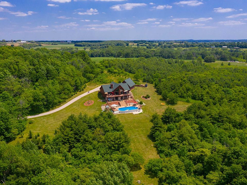 Secluded hilltop log lodge style home! Spacious Chalet home known as Hilltop Haven sits high on hill among 26 wooded acres. Large covered front porch, sprawling deck with glass railings on back overlooks iconic countryside and water views from every room in the house. Kitchen has newer SS appliances, granite, island, dining area, hickory flooring. Great room with vaulted ceilings. First floor master suite leads to deck. Mud and laundry room off 3-car garage. Large bonus storage above garage. New roof. Loft can be den-office or 4th BR. Lower level has 2 large BR's, full bath, sauna, walkout to patio with hot tub, 21x42 pool with deck. 30x50 pole barn with concrete floor, wired 220, perfect for shop or storage. Outdoor wood furnace with integrated gas to virtually eliminate your heat bills!