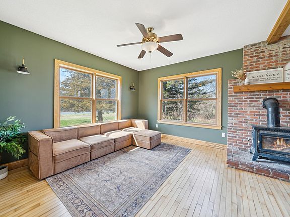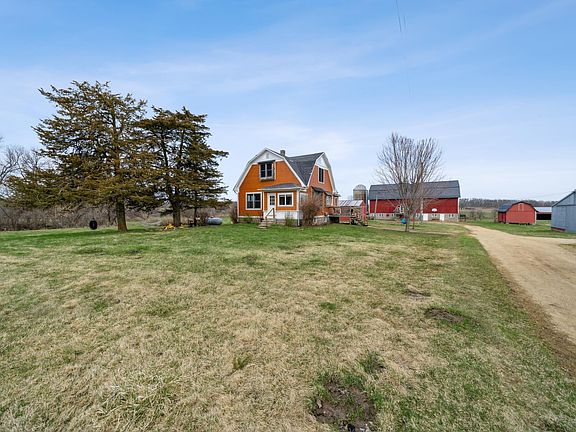This charming 10-acre hobby farm is available due to the owner's relocation. The family has cherished this home and made numerous updates, including a new furnace, air conditioning and a reverse osmosis system, just to name a few. The home features a living room, dining room, kitchen, bathroom, porch and office, all adorned with beautiful maple hardwood floors. Upstairs, you will find three bedrooms and a full bathroom. The barn and grain houses have newer roofs, and there is electricity available to the barn and all pole sheds. The property includes several outbuildings: a 56 x 30 pole shed, a 64 x 40 machine shed and an 80 x 30 barn, plus a pasture that boasts full electric fencing. This scenic parcel offers so much potential. The home provides stunning views in all directions and enjoys sunlight throughout the day. Don't miss this opportunity book your showing today!
