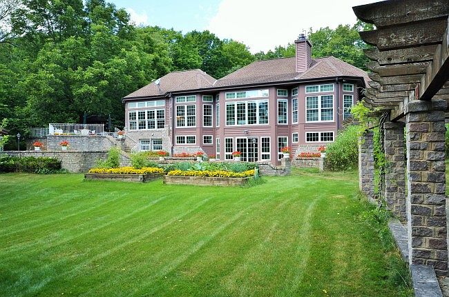 Truly unique custom built exposed ranch overlooks private backyard paradise. Extraordinary curb appeal. Masonry work sourced by using pavers from Milwaukee's own South Water Street. Quality craftmanship evident throughout features - crown molding, 10 foot ceilings, transom windows, Brazilian cherry floors, 2 fireplaces, 1st floor laundry & custom upgraded elevator. Handicap equipped in-law suite complete with 2nd kitchen in lower walkout. Versatile 2400 square foot guest home/outbuilding has office, large conference/living room, full kitchen, 1.5 baths and two 12 foot overhead garage doors leading to parking for 8+ vehicles. Separate 27x67 garage with 8 foot doors. Serene setting with pergola, pond and fountain by gazebo and large patio. Explore 42 sprawling and diverse acres with creek. Garden area has 16x24 barn with water and electric.