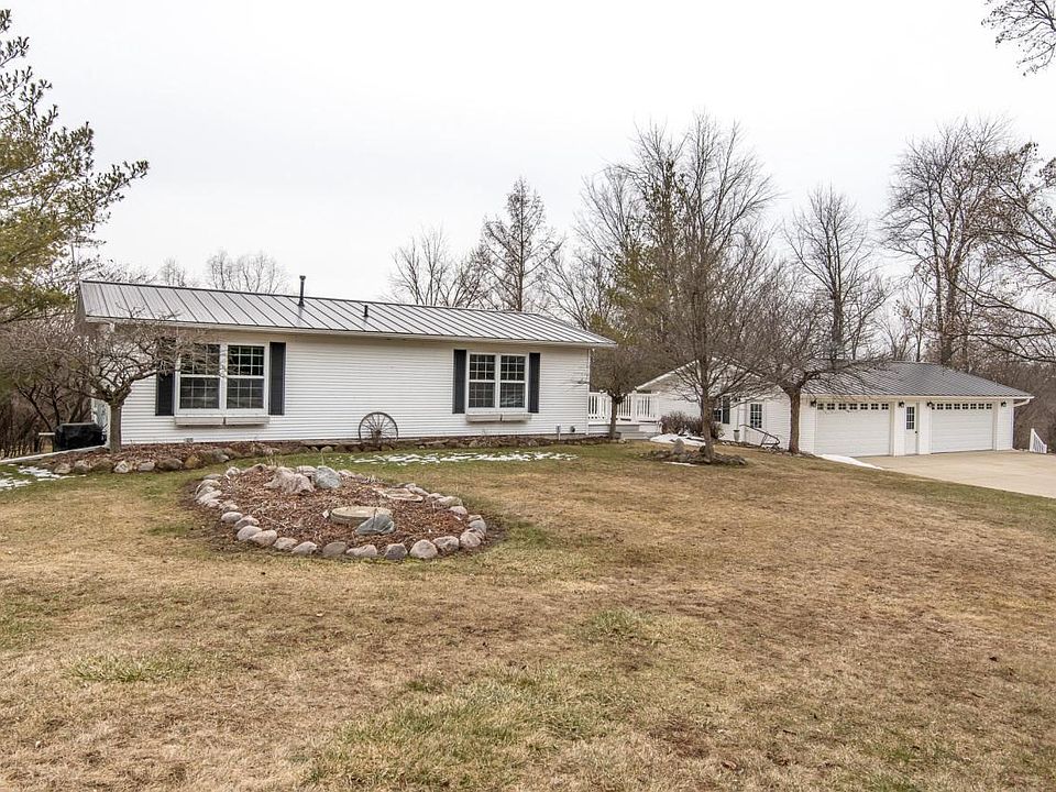 Calling all nature lovers! Imagine owning 9.5 acres of wooded paradise with a charming walkout Ranch w/4.5 car detached garage with both structures having a metal roof. With an expansive deck running the length of the home, you can relax while overlooking the man made pond w/separate well to maintain the water level. With an up north feel, you'll love the cozy, open floor plan with beautiful woodwork and double sliding patio doors to stay connected to nature, all while nestling up in front of the gas fireplace. Your walkout lower level shines with beautiful woodwork and gas fireplace with stone accent wall. The workshop room in the basement has an egress window and could be turned into a third bedroom and another area is plumbed for adding another bath and equity in your home!