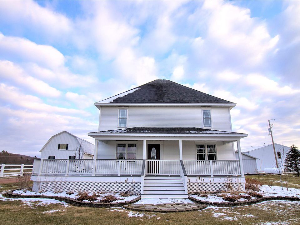 Nothing else like this! Pristine setting with the Pine River meandering through the pasture. Complete restoration of the 2-story farm house with 4 bedrooms, 2 bathrooms, original hardwood floors in the kitchen, dining, and great room, a main floor master suite, main floor laundry, cherry cabinetry, and granite counter tops. LP forced air heat & central air, 200 AMP electrical service. There is a porch with access to the basement and a New wrap-around composite deck overlooking the front pasture and river. For further entertainment, enjoy the open gazebo by the outdoor covered patio with electricity, lights, a fire pit, and grill. Detached 2 plus vehicle garage with 3 overhead doors, 40x70 indoor arena with 4 box stalls, 40x84 2-story barn with attached 40x48 single story and an attached 14 foot wide enclosed storage area. Main barn consists of upper storage with all new 2 inch floor planking, decorative lighting for venues, lower level has box stalls, tie up/tack up stalls, tack room and office - the remainder area can be storage or more stalls. An additional 32x62 barn has 3 levels, lower area use for livestock coating, main level as storage and upper level as grainery or storage. All the farm buildings have metal siding and metal rooves. 2 automatic waterers, excellent fencing all around, divide pastures. The Entire Property is in absolute Mint Condition!