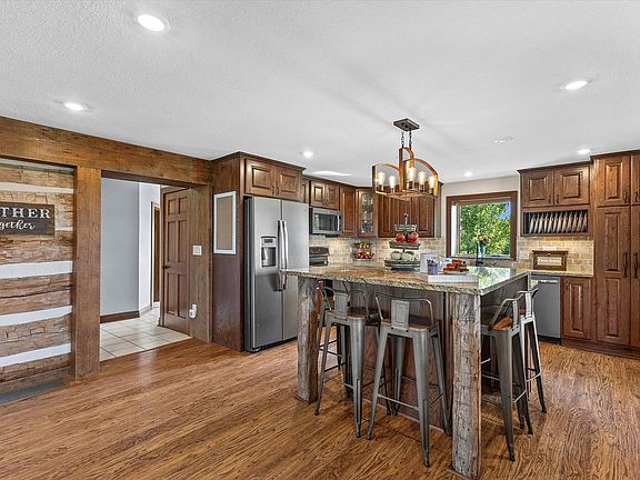 Experience the charm of country living where your hobby farm dreams come true on over 5 acres of rustic paradise. The updated kitchen is the heart of this home, with ample space and modern appliances. Enjoy an expansive laundry room & generous closets throughout, ensuring plenty of storage space. Roam through your mini orchard, picking fresh fruit or collect eggs from your hens enjoying their cozy chicken coop. For those tranquil afternoons, relax in the gazebo by the pond or host friends and family on your oversized patio. A fenced pasture & several outbuildings ensure you have room for any project; featuring an office, workout room & even a built in bar. Whether you're looking for a peaceful retreat or a spacious setting for entertaining, this property is a rare find!