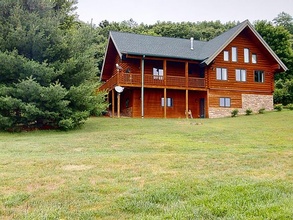 Private rustic setting for this 2004 beautiful log home w/large shed. 11.45 acres and 4.2 acres are cropped & rented for $400/a yr. Open floor plan on the 1st level consisting of, laundry rm, a kitchen w/hickory cabinets & an island that seats four, an informal dining rm, living rm w/a gas fired stone & brick fireplace. Soaring ceilings, wood beams & lots of tall windows. Master bdrm w/walk-in closet, 2nd bdrm, full bath w/garden tub and shower are also on the 1st level. 2nd floor has huge family room & 3rd loft bdrm. Lower level has a 2nd full bath and all of it has been sheetrocked, but has not been made into any rooms yet, but there is room for a 4th bdrm, & more. Back enclosed porch over looks the woods. You will love this country property and your animals will too!