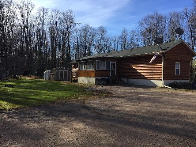 WOODED COUNTRY HOME! This property has everything you want in Northwoods living. 5 hardwood acres with a manicured yard loaded with apple, pear, and plum trees. The home int. sports 3 bedrooms and 2 bathrooms, one with a walk in shower and the other with a full tub. Open concept kitchen and dining area and spacious living area. This beautiful 20x24 addition to the manufactured portion of the home has a vaulted ceiling with ceiling fan, tongue and groove pine, and a wood stove mounted on a ceramic tiled hearth area that brings warmth to the entire house. Exterior features include a sitting area with shrubs and rose bushes, a patio area for grilling and a deck off the carpeted enclosed 3 season porch. A fenced garden, 3 sheds and the 60x40 steel building with workshop area and cement floors complete the property. Property nestled in the heart of 4 wheeler, snowmobile, rafting, fishing, and kayak country. Call today!