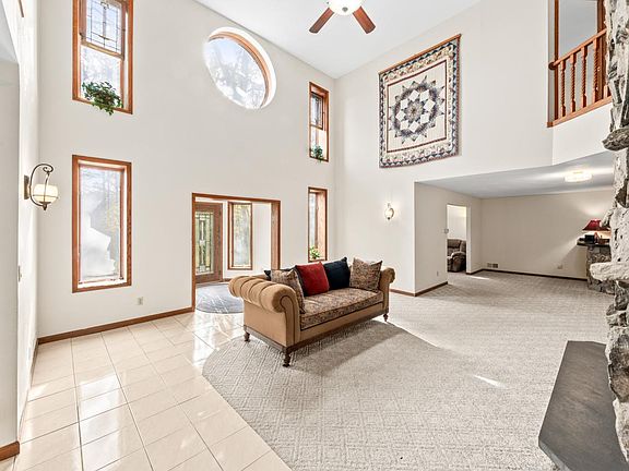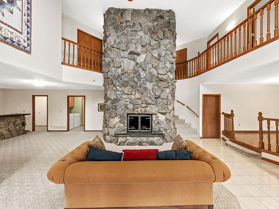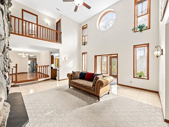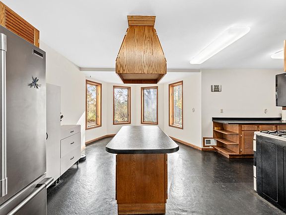 Spacious contemporary home with 4 BR's, 2.5 BA's 2.5 car attached garage set on 3.34 wooded acres. This home offers 4549 sq. ft. above grade and is primarily built with concrete walls and Spancrete ceilings/floors and is set into the hillside. Entering into the front foyer, you will be greeted by a massive natural stone 18' tall floor to ceiling fireplace which is open to the FDR and LR complete with a dry bar. Large and bright KIT with a large neighboring pantry/bonus room. No basement but plenty of closets and storage rooms throughout. Two separate staircases to the upper level. All 3 BR's upstairs are large and have WIC's. The huge primary BR is waiting for your finished walk-in shower ideas. This home needs some TLC & updating (reflected in the stellar price of only $121/sq. ft.).