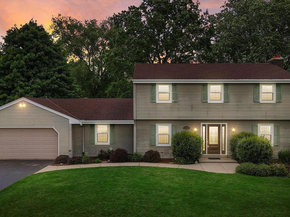Spacious 4 Bedroom Colonial Home with an amazing Private Lot situated on a quiet no through street! Great room with new carpet and cozy gas fireplace opens to the eat-in kitchen with patio doors to the deck overlooking large yard with a tranquil pond! Main floor also features laundry room, powder room, den or office with built in bookshelves, and dining or play room. Relax outside in a chair by the firepit, while enjoying the tiered landscaping to one side and pond to the other. Plenty of storage with a 2.5 car garage and garden shed with power. Interior has lots of newer flooring, new carpet, fresh paint, and updated full bath. AC new in 2020. See it today!