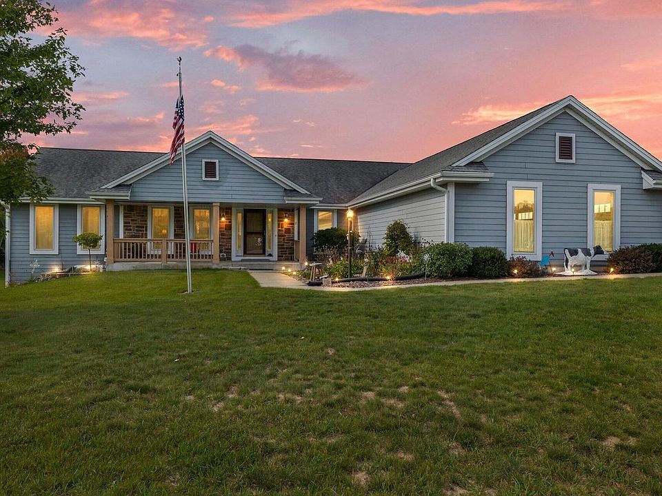 Rural 3 acre lot with views of nature & the most spectacular sunsets. This luxury split ranch has an open concept offering 3 BD, 2 full BA, vaulted kitchen with oak custom cabinets, breakfast bar with granite counter tops. The dinette is sundrenched with large windows that flood the home with extra sunshine. The vaulted great room was designed for large group entertaining with a gas fireplace flanked with natural stone. The bench window seat allows for extra storage. Vaulted MBR features a walk-in closet. MB is a single vanity with a walk-in shower and ADA tile tub. Fully exposed basement with full height windows and patio doors, utility sink and also plumbed for future finishes being hydronic & bathroom. Extra deep 3-car garage has ADA threshold entry. Addtl outbuilding 40x30.