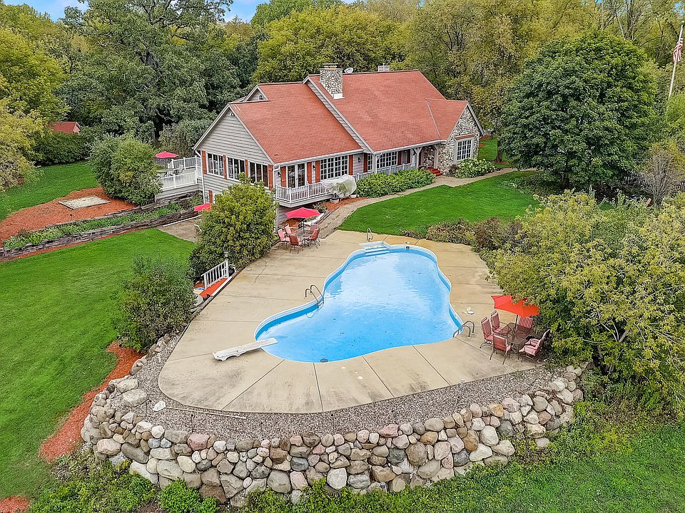 Remarkable opportunity in the heart of the Kettle Moraine lies this 38 acre estate. Offering pasteur land, Class 2 spring fed trout stream, 3 acre waterfowl sanctuary and Blue Ribbon hunting opportunities, while providing exceptional living options. Custom built country cape cod with reclaimed barnwood beams, harvested plankwood floors, 5 bedrooms, full private master suite, loft and main floor den w/ builtins. The whole house is anchored w/ an open two sided field stone fireplace. Formal dining rm and main floor utility. The 3 sided sunroom overlooks the pond. Lower level rec rm, family rm & kit suite. Three decks, incredible inground pool, SheShed walking trails, and fully function barn with tack area, 4 formal stalls, 2000 bale hayloft and parking for all of your needs. See Today!