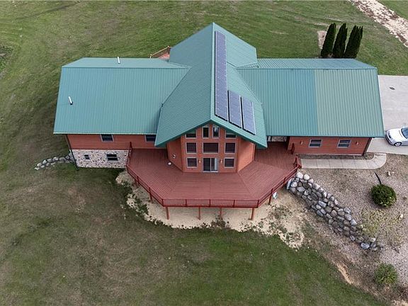 Privacy, Privacy, and more privacy, this home on 15 acres is entered by a winding paved drive through the trees and then opens up to a beautiful hilltop with a gorgeous view. This bright and airy 5 bed 4.5 baths home has many amenities such as geothermal, solar panels and even a windmill that are going to save you thousands of dollars per year on the utilities. over 5,000 s.f. finished this home is large enough for a growing family or a quiet getaway for just one or two. This home is built to allow the most efficient use of the sun which warms the main living areas quite well even in the dead of winter. The kitchen has all of the best appliances and a huge center island and butlers pantry with lots of room to visit as well. The oversized 3 car garage has in floor heat & there is even a 44' X 36' Pole building.