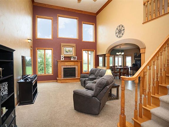 Walk out 1.5 story home that sits on 4+/- acres! As you approach the home the covered porch greets you. Step inside the home and you find the grand foyer leading you into the Living Room with soaring ceilings, gas fireplace with a wall of windows for your beautiful views of your land! Adjacent is the Breakfast area with a patio door leading you out to your stamp concrete patio. The Kitchen features stainless steel appliances, pantry and a snack island. Large Master Bedroom with walk in closet and master bath with dual sinks, whirlpool tub and separate shower. Convenient Office is off the Foyer. First floor laundry with lockers is located by the 3.5 attached Heated and Finished garage that has stairs to the Lower Level. Upstairs are 2 bedrooms with and a unique Jack and Jill Bathroom for getting ready. Cute loft area makes for a great reading area! Walk out Lower Level is finished with a Family room with and adjacent room. Finished flex room with a walk-in closet is sure to please along with a separate finished area for a game area. 4th bedroom with a full bath completes the Lower level. Enjoy the Privacy of these 4 acres of land!