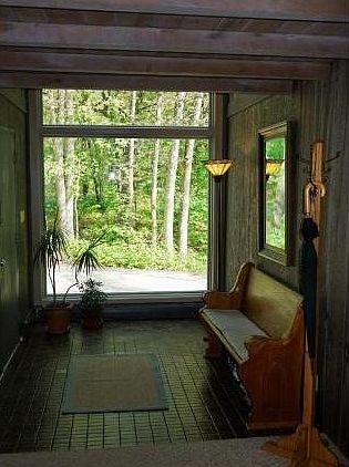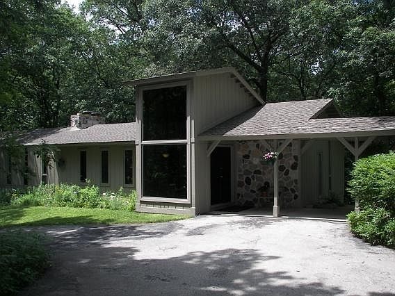 Architect Robert Knopp designed this comfortable 4 BR/2 BA open concept home for his family; the second owner now offers it for sale. The design shows Frank Lloyd Wrights influenceclean lines, tall windows, a tree top deck connecting it to the rolling Kettle Moraine. Adjacent to kitchen with breakfast bar, a dining area opens to screened porch overlooking forest with private walking paths. Note natural fireplace, wood burning stove insert, and hidden access to storage loft. Covered breezeway attaches house to 3.8 car garage with workshop, and separate potting/tool shed offers even more storage. Decorate as Mid-Century or Scandinavian Modern, Arts & Craft, or Traditional home.