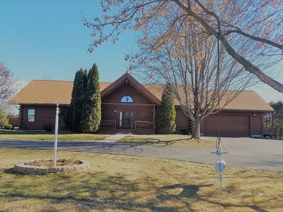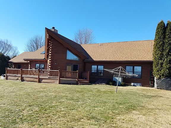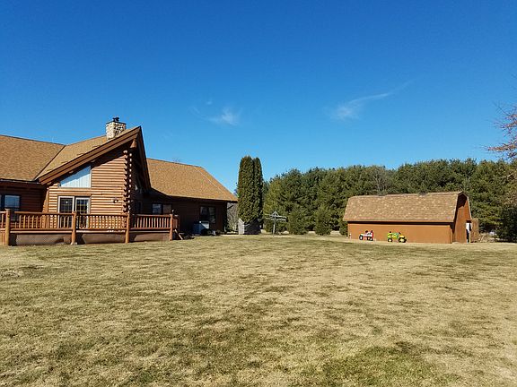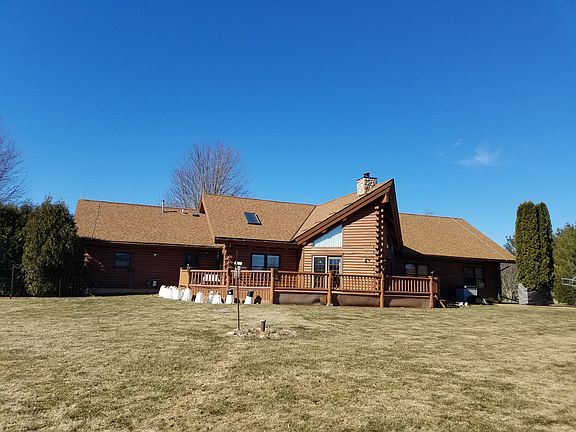 Picturesque & serene 3+ acres with the Ashippun river running through, is the setting for this energy-efficient, custom-built, one owner, timber frame FULL LOG HOME. Amazing entrance with huge vaulted timber beamed ceiling, 2-story stone natural fireplace, hardwood floors. Kitchen boasts large island, new floors & skylights. Great open floor plan for entertaining, with wrap around over-sized deck. Lower Level finished with large rec room, & 3rd bath as well as two separate rooms to use. All this on a rural setting of 3 private acres. Extra one car sized garage plus shed. Start packing!
