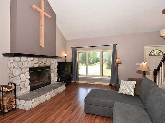 Kettle Moraine School District in a great neighborhood! A quick bike ride away for the kids to get to school. Living room features beautiful vaulted ceilings and fireplace open to the kitchen with large island/breakfast bar area and beautiful white cabinets. Patio doors lead to spacious yard great for entertaining guests with large patio area and hot tub. Extra 1.5 car heated garage storage area. Spacious master bedroom with walk in closet and master bathroom. Loft area great for office or family room sitting area. Convenient first floor laundry. Extra bonus room in basement with french doors and 2 newly installed egress windows in the unfinished area is awaiting your finishing touches! Seller is including a home warranty for peace of mind.