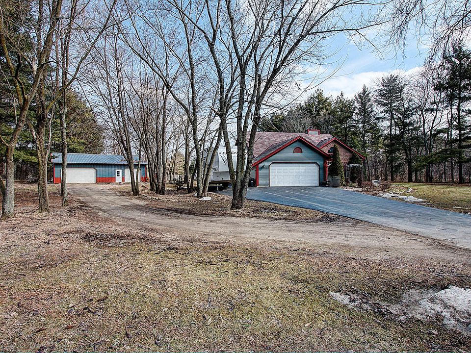 Sitting on 3 acres of land, this home has the space you've been looking for & so much more! Open living room w/vaulted ceilings & beautiful stone fireplace. Kitchen/dinette area w/sliding doors out to deck & family room in exposed lower level. Outside you will fall in love w/the mix of mature trees for privacy but also plenty of yard for running around. In addition, there is a large pole barn w/ garage doors for all your toys, tools & storage as well as a chicken coop & fencing. Quiet neighborhood, Nature conservancy land across the street & state horse trails at the end of the road.
