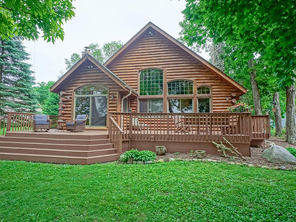 Beautifully designed log home on a gorgeous lot with 60 ft. of frontage on School Section Lake! Enjoy gorgeous lake views, sunsets, and all the lake activities. Spacious interior offers vaulted great room with a wall of windows toward the lake. Home has 3 fireplaces. Kitchen features breakfast bar and appliances included. Large pantry. Main floor master suite has walk-in closet and attached bath. Additional bedroom on main level. Large main floor mud-laundry room. Upper level boasts a 3rd bedroom, full bath, and large loft/4th bedroom. 3+ car attached garage. Outside you'll enjoy the lakeside firepit area. Excellent frontage. Lake offers great swimming, fishing, jet skiing, water skiing, and kayaking, Pontoon boat and ski/fishing boat are negotiable!
