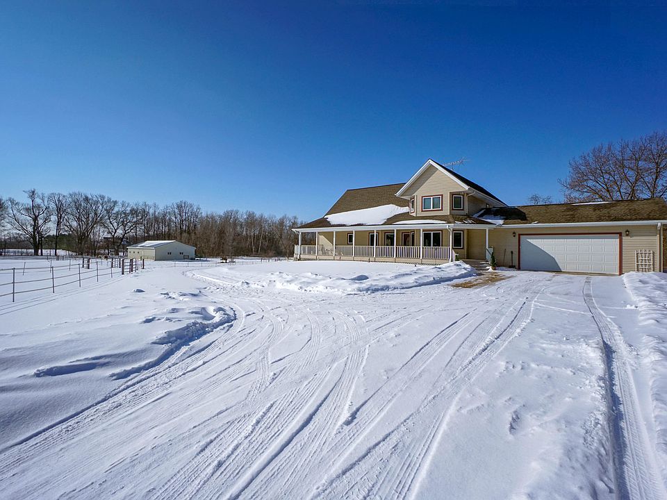 Exceptional home and setting on nearly 15 gorgeous acres in the Town of Ottawa! Enjoy this remarkable lot with open space, pastures, outbuilding, and woods. Spacious 4400+ sq ft home features wrap-around front porch and 4BR/3.5BA. Beautiful open concept design with vaulted ceiling and open staircase to upper level. Kitchen with granite countertops, large breakfast bar, and adjoining dining room. Gas fireplace in great room. Patio doors to huge back yard deck. Main floor master suite. Finished walkout lower level. Outbuilding is horse ready with 7 stalls, electric, and water!