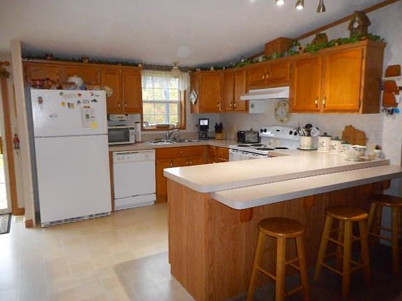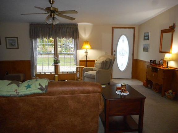 Peaceful and quite neighborhood! Circle drive welcomes you to this flowered line entrance to large inviting living room. Kitchen has plenty of kitchen cabinets. Dining area opens up to large deck overlooking back yard with some apple trees and park like setting with Little Evergreen Creek meandering through the property. Master bedroom and master bath with skylight. Bedroom, office and full bath with skylights on opposite end of house. lst floor laundry. Family room addition heated by freestanding fireplace accented with partial stone wall and wood cathedral ceiling. Patio doors open up to large patio. Attached 2 car garage with door on opposite side for easy access to back yard. Shed and portable shed. Don't let this home pass you up!!!