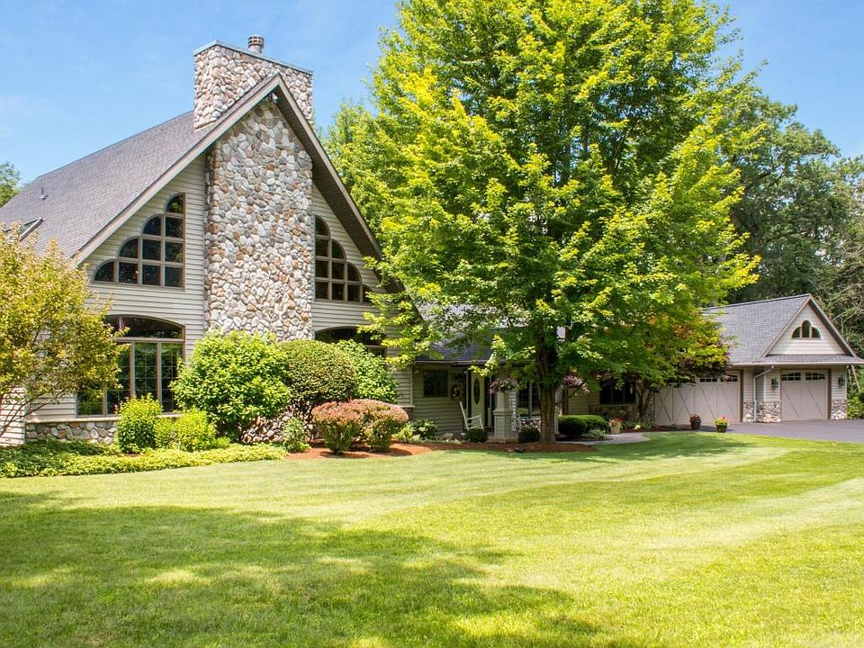 Unique contemporary prairie style home w/vaulted beamed architecture, 4 bedrooms (5th in LL), 1st & 2nd flr master, 3 full, (2)1/2 baths & stunning 2 story stone fireplace sits on 2.85 stunning acres. This amazing property boasts hardwood, custom kitchen w/full dining sized granite island & bright large eating area. Doors out to screened porch lead to a deck overlooking gorgeous grounds & fire-pit. Great room w/2 story stone fireplace & full bar. Master suite w/balcony & loft area overlooking great rm. 2nd master bdrm on main level w/private entrance to screened porch. Finished LL & much more