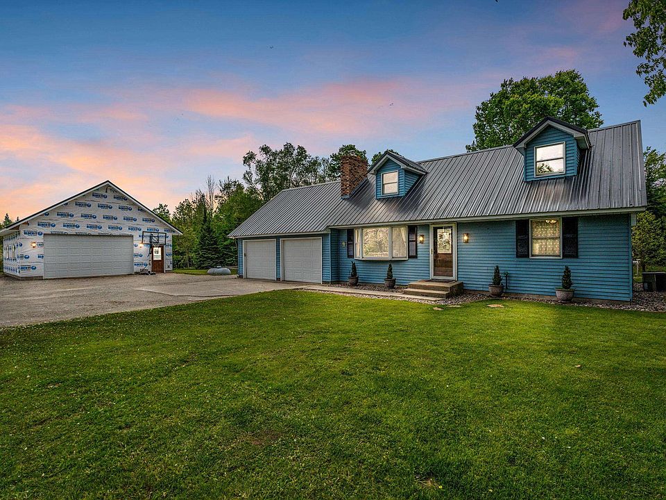 Discover this stunning three-bedroom, two-bathroom home set on 6 acres of picturesque land. Both bathrooms have been beautifully renovated with tile, modern showers, and rain showerheads. Enjoy cozy evenings by the wood-burning fireplace in the living room or unwind in the three-season room, complete with a Murphy bar for your favorite drinks. This property is a country lover's dream, featuring a 28-tree apple orchard, additional fruit trees as well as wild raspberry and blackberry bushes in the woods. Explore the scenic trails, relax on the private back deck, or tend to your fenced garden area. The home includes a 1.5-car attached garage with upper storage, plus a heated, insulated four-car detached garage, equipped with an on-demand hot water heater and a partially finished loft.