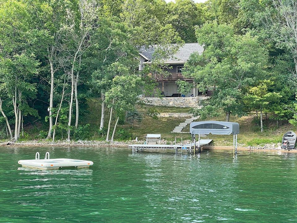 Walkout basementGorgeous lake viewsSandy frontageCathedral ceilingsCentral airDeck or patioGently sloping tree-lined lot