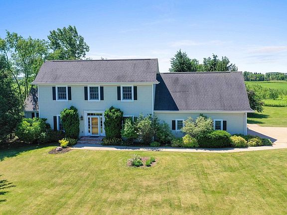 Classic Colonial Two-story, set on beautiful 5.22 acres! If you desire privacy, just minutes away from Green Bay or the Fox cities, this home is exactly what you've been waiting for! It feels like home the minute you pull up the winding driveway. Features Large foyer, warm and inviting great rm, centered by a gas FP, spacious breakfast area flows into the Open kitchen, w/large center island w/granite counter, ceramic backsplash and tons of custom cabinets! 1st Fl Primary Suite w/full private bath, including a walk-in closet! Huge walkout LL Rec-room w/wet bar, 2nd gas FP & half bath! 28x30 attached garage, fenced yard, 38x50 detached RV garage w/shop area & half bath! You'll enjoy the covered back patio both morning and night, so bring your coffee and wine, and make this house your home!