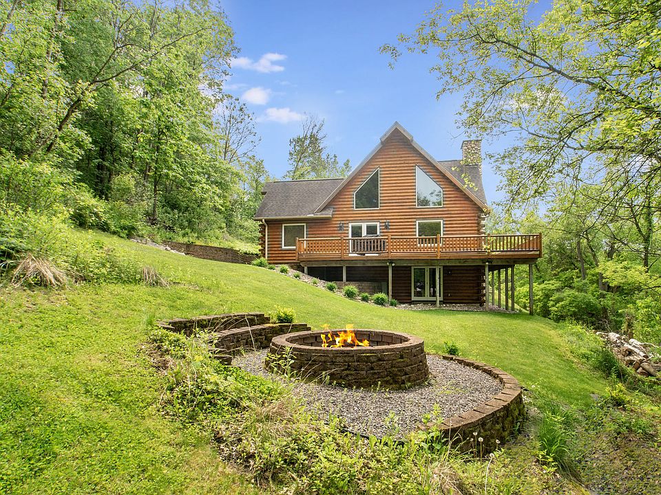 Log cabins stir deep rooted feelings of warmth, comfort & that American yearning! A step into this masterpiece will undoubtably create those classic feelings! Handcrafted details, modern conveniences & spectacular views are just a few of the amenities you'll fall in love with. Nestled along a hillside overlooking your acreage, this open concept log home features an expansive kitchen with center island, grand stone fireplace, hand hewn exposed beams, grand open staircase, lofted reading nook, lrg floor to ceiling windows & a master bedroom suite that will have you in awe! Escape into your ''FROG'' (fun room over garage'' which currently is being used as an exercise oasis. Walk-out lower level is ready for your touches - stubbed for a future bathroom & adorn w/ full size windows.
