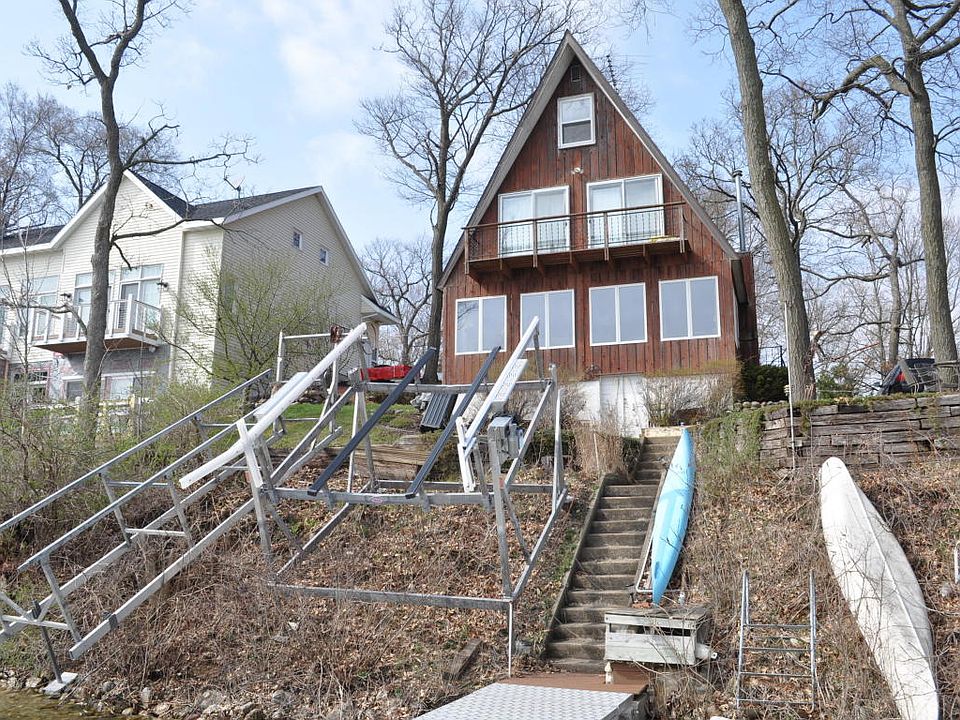 Fantastic location on Mill Lake featuring 75' of sand and gravel frontage. Charming chalet w/3BR, large sleeping loft and 1.5BA. This sunrise location w/limited steps to waterfront and great swimming. Open main level w/eat-in kitchen and LR w/incredible lake views. Upper level has two lakeside bedrooms w/balcony, full bath and office area. Main floor laundry and full basement. Located near end of road w/limited traffic and views of Turtle Bay.