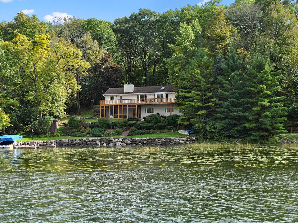 Rare opportunity to own over 2 wooded private acres with 160' on Middle Lake is where you'll find this 4 Bedroom, 3 bath Ranch home with walk-out lower level. Inside you'll find vaulted ceilings throughout main level with eat-in kitchen with Island and breakfast bar, dinette lakeside and sliding glass door to huge deck, living room with fireplace, Master Bedroom suite whirlpool tub, separate shower and deck access. Family room with fireplace and sliding glass door to screened porch lakeside , plus 2nd kitchen with breakfast bar, Large storage room in LL with outside lakeside door and stairs to 3.5 attached heated garage. Lakeside shed off pier. Too much to list, must see!