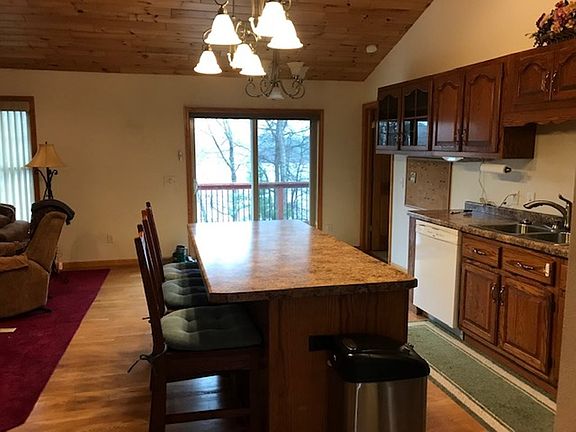 Lovely Ranch home on Crystal Lake! With 100 feet of water frontage on Private Crystal Lake, this home offers amazing views of the lake from upper and lower levels of the home. 11 year old Custom built home features open concept living room and kitchen area with vaulted Pine ceilings. Living room has a stone fireplace with authentic wood burning stove from South Africa and custom carved wood mantle. Kitchen features a large breakfast bar with stools and appliances open to the living room and dinette area.Beautiful Oak Wood flooring in dinette, kitchen and foyer areas of home. Home has almost 2000 finished sq feet with Two bedrooms up including the master suite with his and her closets and master bathroom. Also, two bedrooms in the exposed lower level walk out. Total of 4 bedrooms and 3 bathrooms in the home. Finished family room in lower level also walks out to the patio and backyard. Newer composite deck from Upper level features retractable awning and also offers lovely views of the backyard and lake. Main floor laundry, all appliances and central air are included as well. Home has plenty of storage space and lots of character throughout. Two and 1/2 car attached garage offers lots of room for vehicles and storage. This home is set on at the end of a Dead End road with Crystal beach nearby for family fun! Amazing home for an Amazing price. LP tank and water softener are owned and conventional septic system. Nice yard storage shed in backyard included. Pull out dock by shore is included as well. This home features a security system, a MUST see!