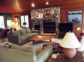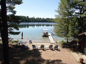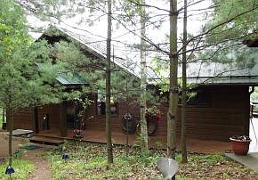 3BR/2BA year round home nestled on 18 wooded acres with 168 ft firm, sandy waterfront on crystal clear Gilbert Lake and additional common use of 100+ acres. Kitchen w hickory cabinets/granite counters. 24x48 garage with 24x24 heated workshop/studio area. Fieldstone wood burning fireplace. Multilevel wrap around decks. 18x11 "guest sleeping area on lower level". 10x18 boathouse.Beautiful setting!